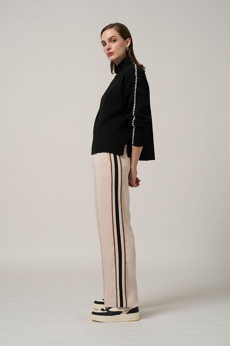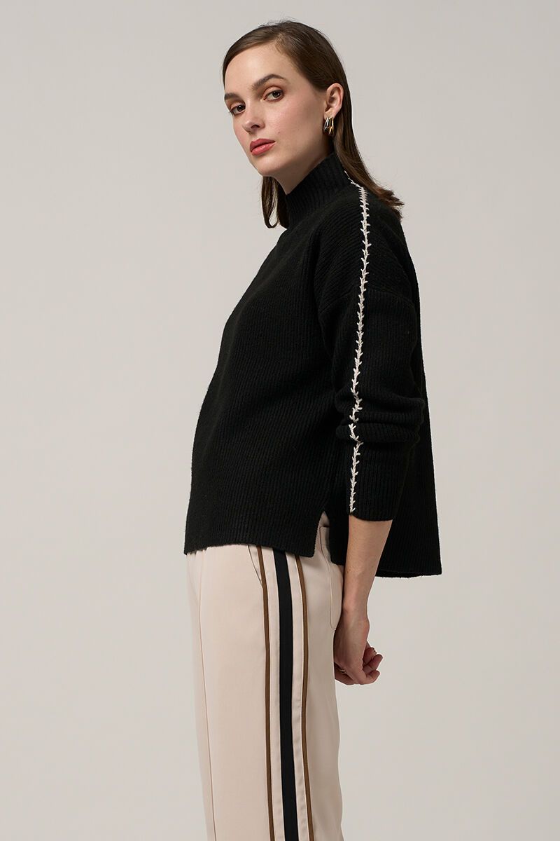 The Navigator Sweater is effortless cool wrapped in comfort. A relaxed fit with a slouchy roll neck, contrast stitching, and a touch of edge—this is knitwear with attitude. Wear it loose over wide-leg pants or half-tucked into a pleated skirt. It’s an easy layer with a little extra something.