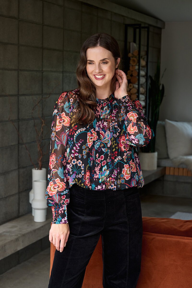 The Memo Pintuck Front Shirred Cuff Blouse, softly draped blouse designed to elevate everyday dressing, featuring delicate pintuck detailing through the front and gently shirred cuffs. A winning style repeated again
