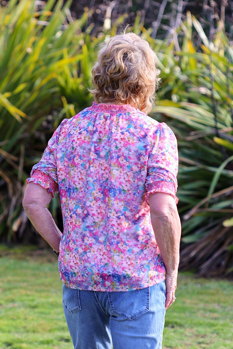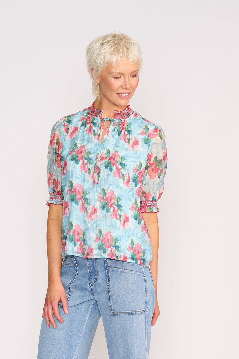 The Memo Shirred Short Sleeve Blouse is soft, floaty, and beautifully detailed. With sheer sleeves, shirred cuffs, and a tie neckline, it’s the kind of easy top that feels special without trying too hard — perfect with white denim or linen.