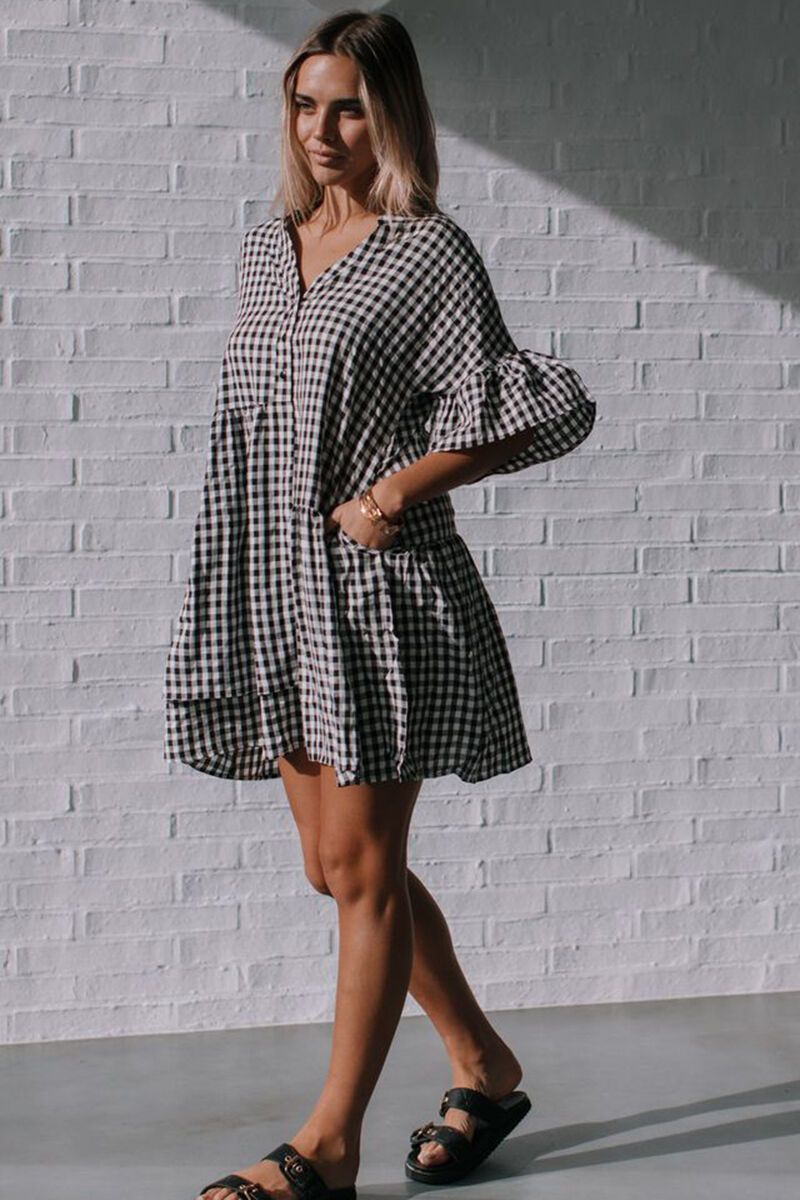 The Miracle Gingham Uneven Button Dress brings breezy, everyday ease in classic black-and-white checks. Featuring a V-neck, ruffle elbow sleeves and a relaxed, tiered smock shape and pockets, this above-knee style slips on for instant weekend chic.