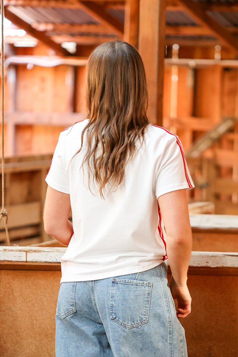 The Moss Bee Tee is a sweet little staple with sporty side stripes and a subtle bee motif that adds just the right amount of personality. Soft, easy, and perfect for warm days, it pairs effortlessly with denim, shorts, or a swishy summer skirt.