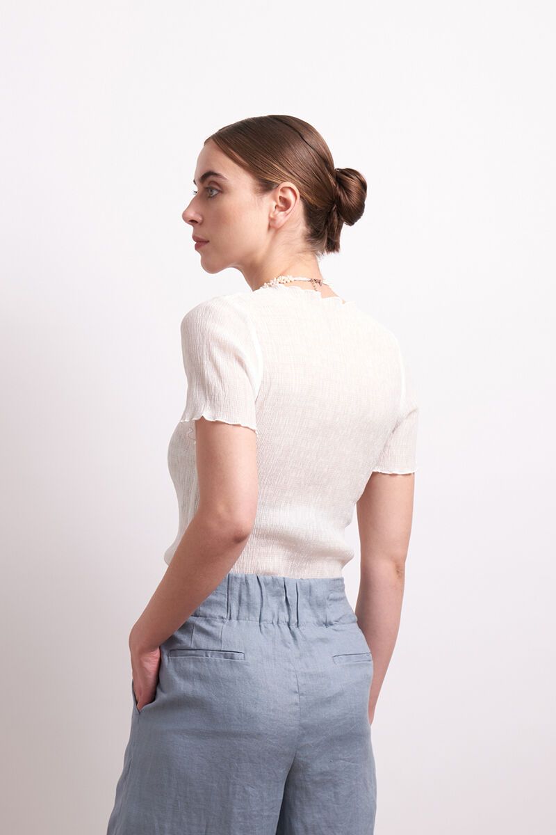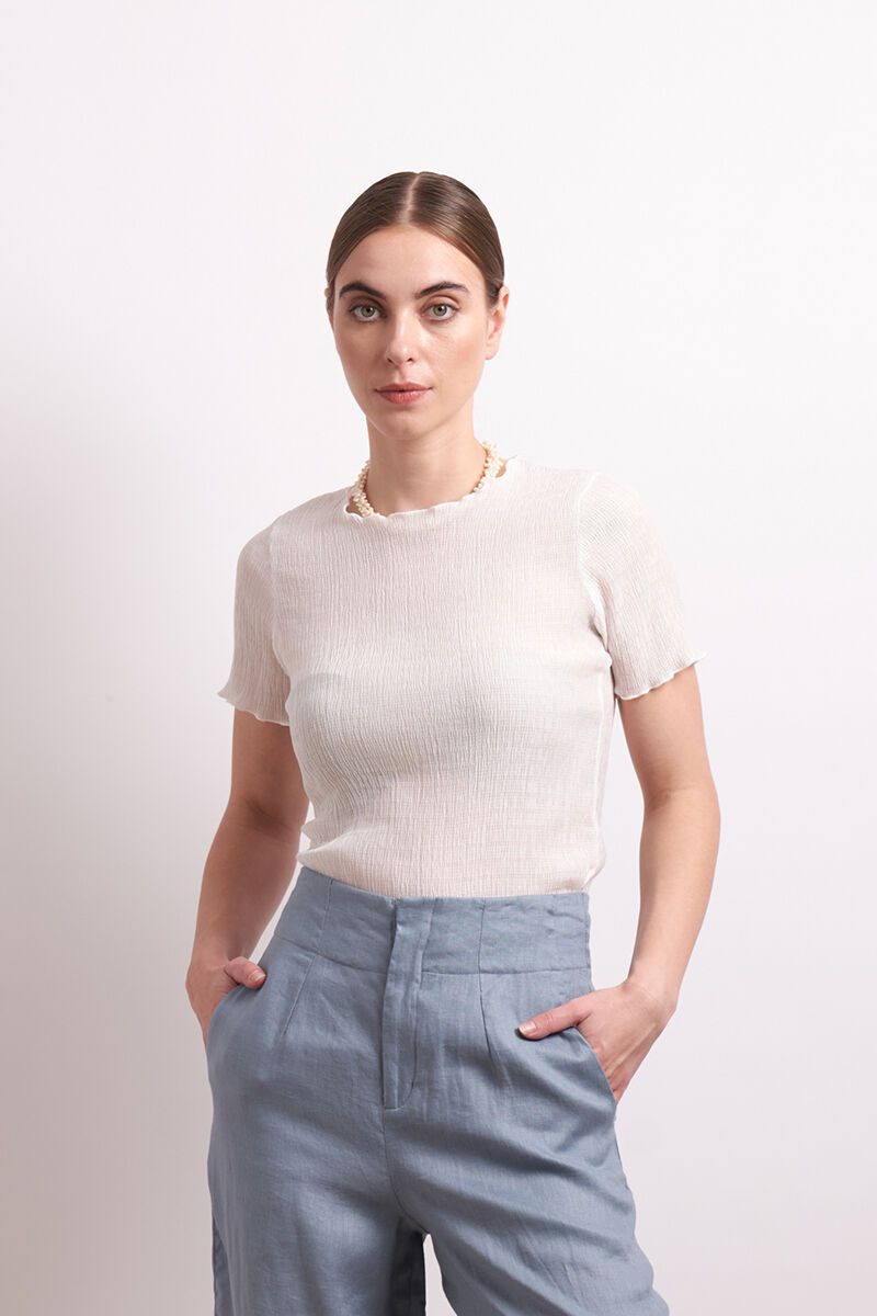 Meet your new favourite layering piece. The Crush Top by Neris features a softly textured stretch fit with a subtle lettuce hem. Easy to dress up or down, it adds a light and feminine touch to denim, wide-leg pants or skirts.