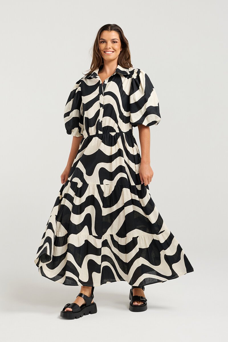 The Amber Dress Truffle Print blends structure and movement with a modern silhouette. Featuring voluminous sleeves and a flowy skirt, it’s perfect for days that start at brunch and end with sunset drinks. Style with sandals or wedges and go.