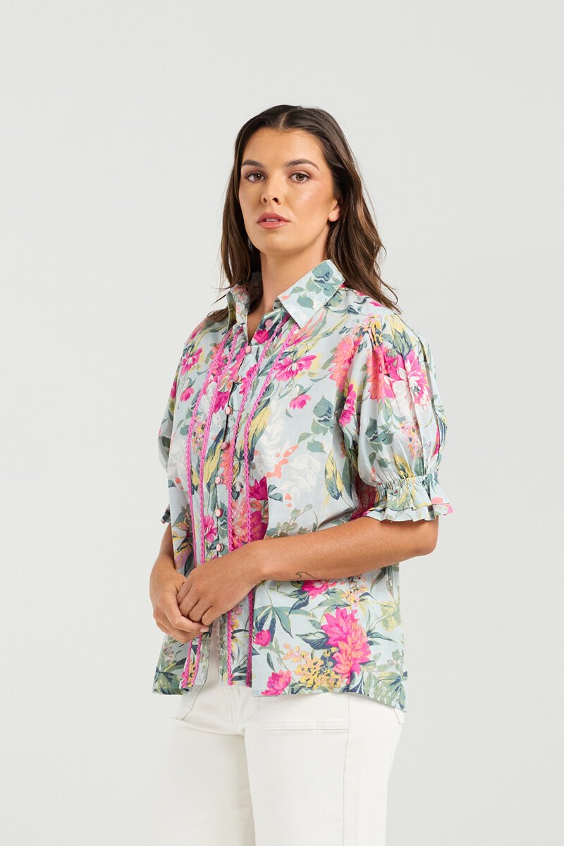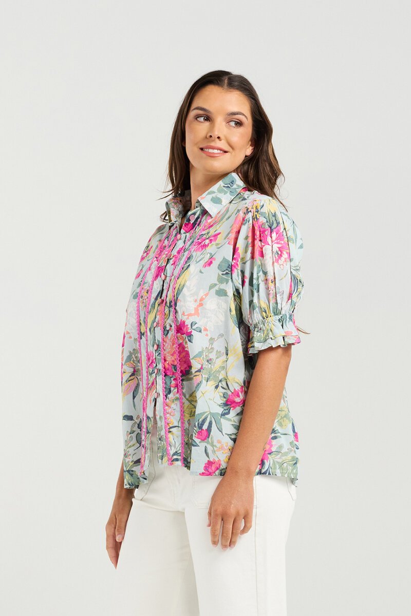 The Bossa Top Azelea Flower Print is pure summer joy — colourful, easy, and full of personality. With its soft puff sleeves, button front, and playful detailing, it’s the kind of top you’ll reach for on repeat all season.