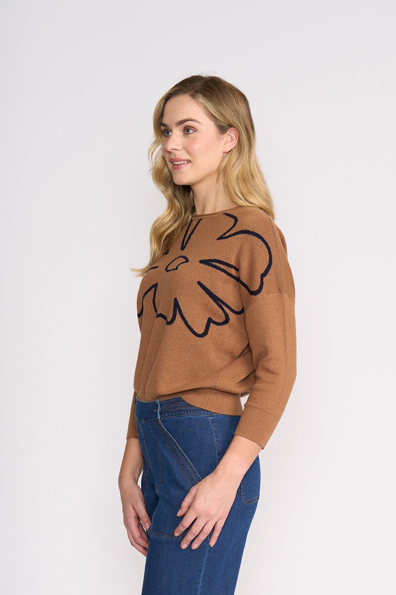 The Oh Three Bloom Top brings playful ease with its bold bloom motif and relaxed, boxy fit. Soft and lightweight, it’s the perfect throw-on knit for denim days, weekend wandering, or whenever you want effortless style with personality.