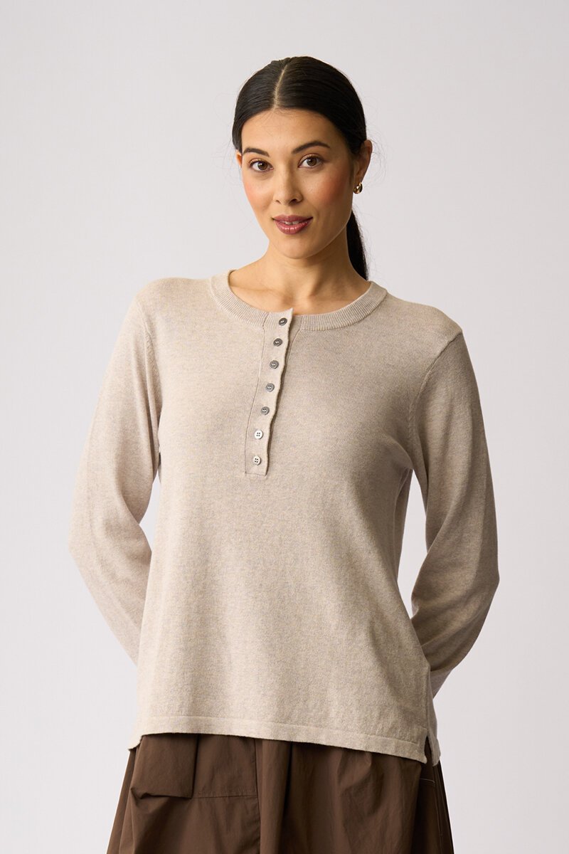 A classic knit with an easy everyday feel, this Henley sweater features a soft round neckline with button detailing through the front. Simple, comfortable, and perfect for layering or wearing on its own.