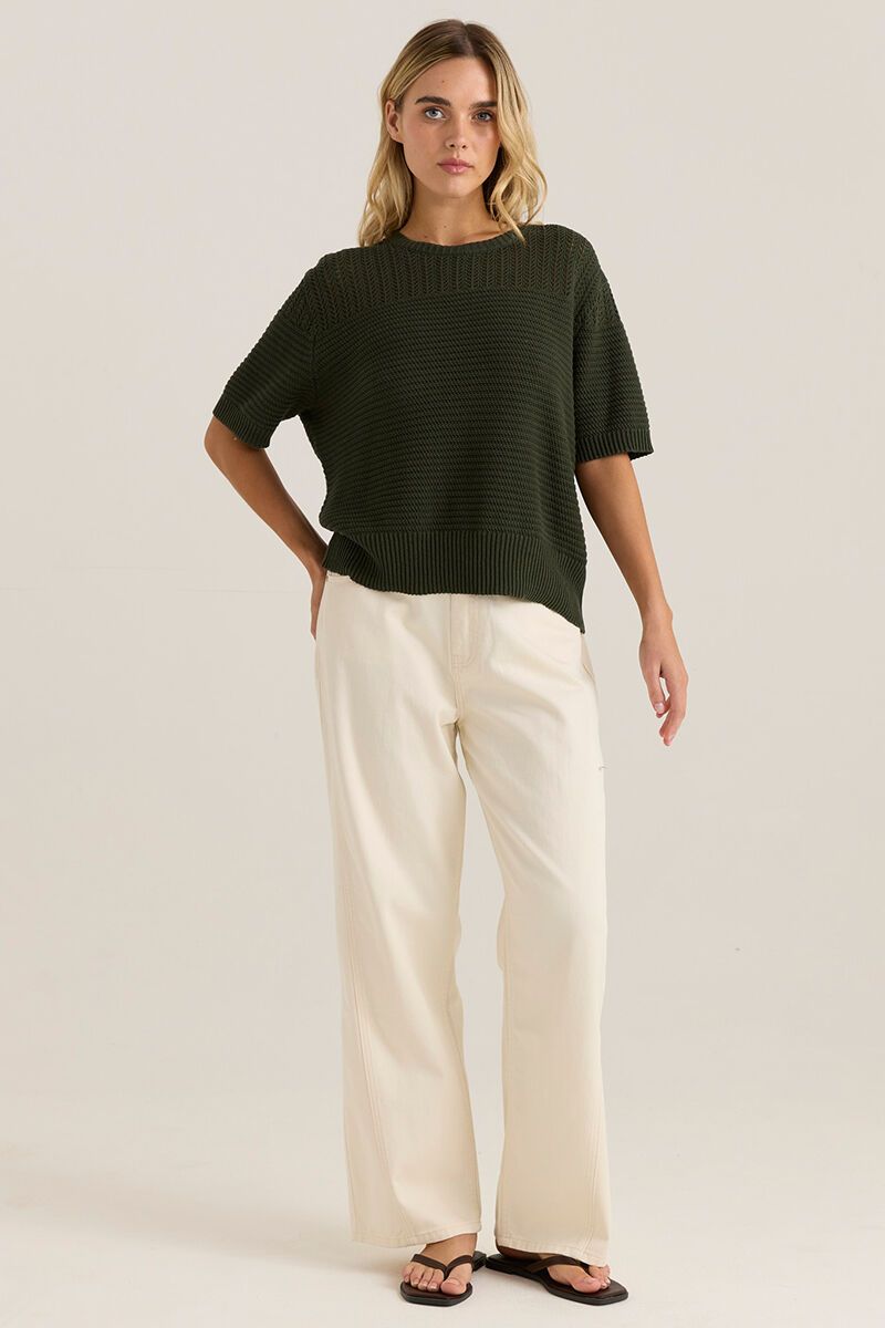 Soft knit tee with a relaxed, boxy shape and subtle texture. Easy to wear, easy to style—perfect with denim, tailored pants, or layered for effortless everyday outfits.