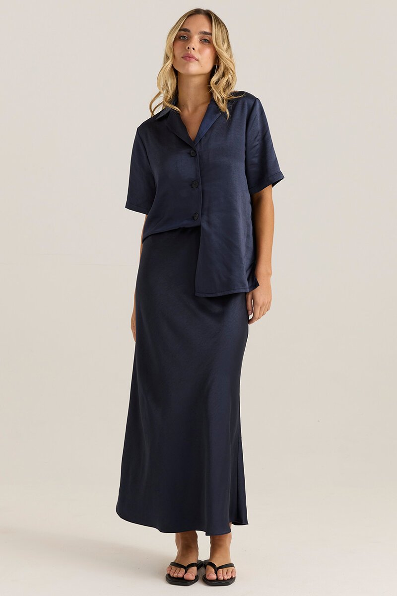 Sleek midi skirt with a soft drape and easy pull-on waist. Designed to skim the body and move beautifully, it pairs perfectly with tees, knits, or the matching Blakely pieces.