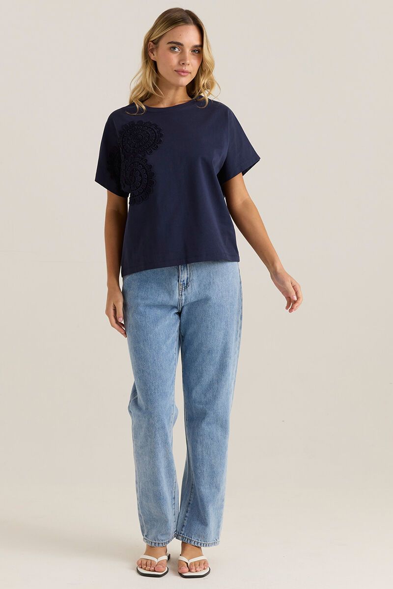 A relaxed tee with delicate crochet detailing for a soft point of interest. Easy, boxy fit —perfect with denim, linen pants, or layered under a jacket for everyday wear.
