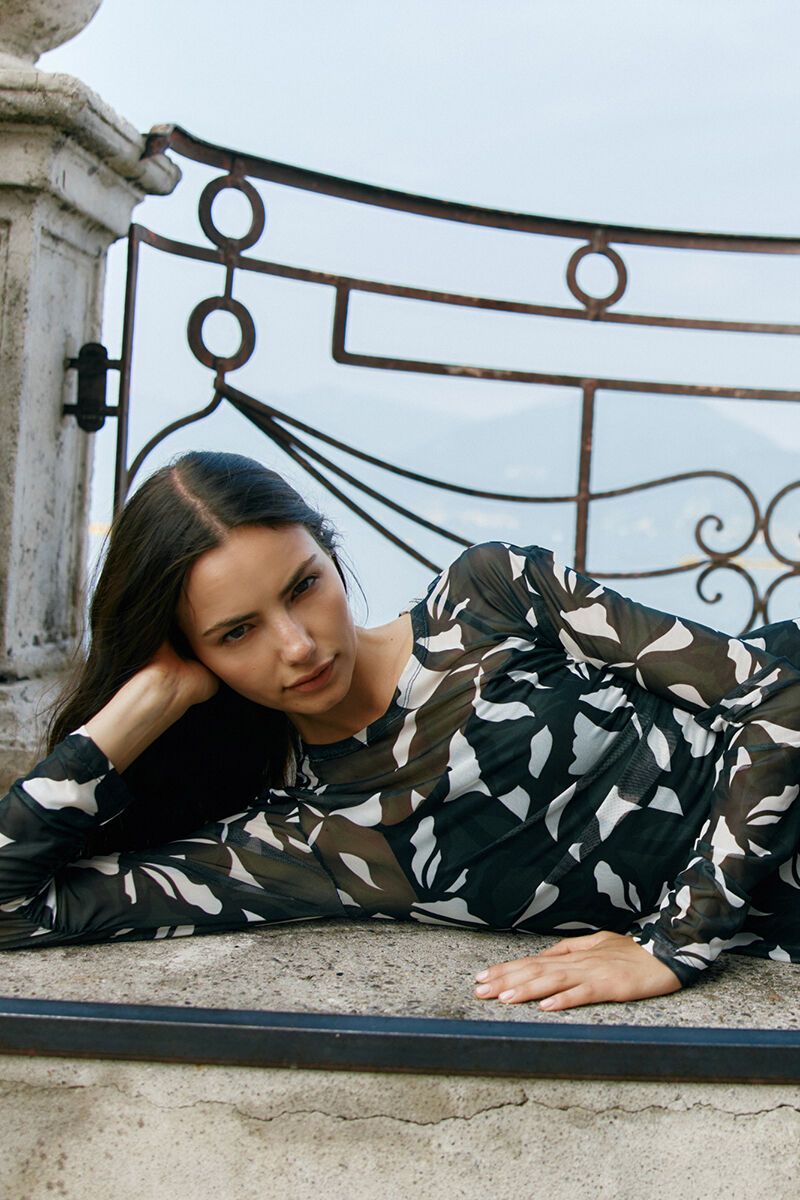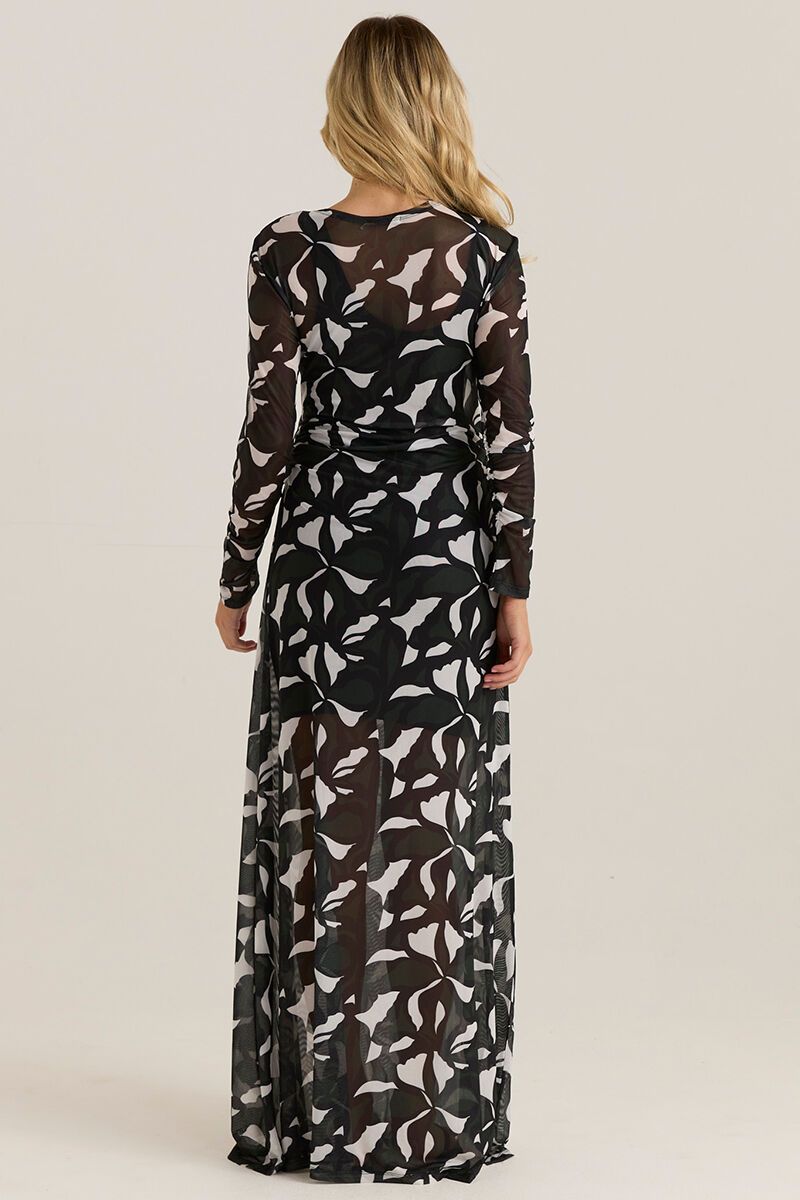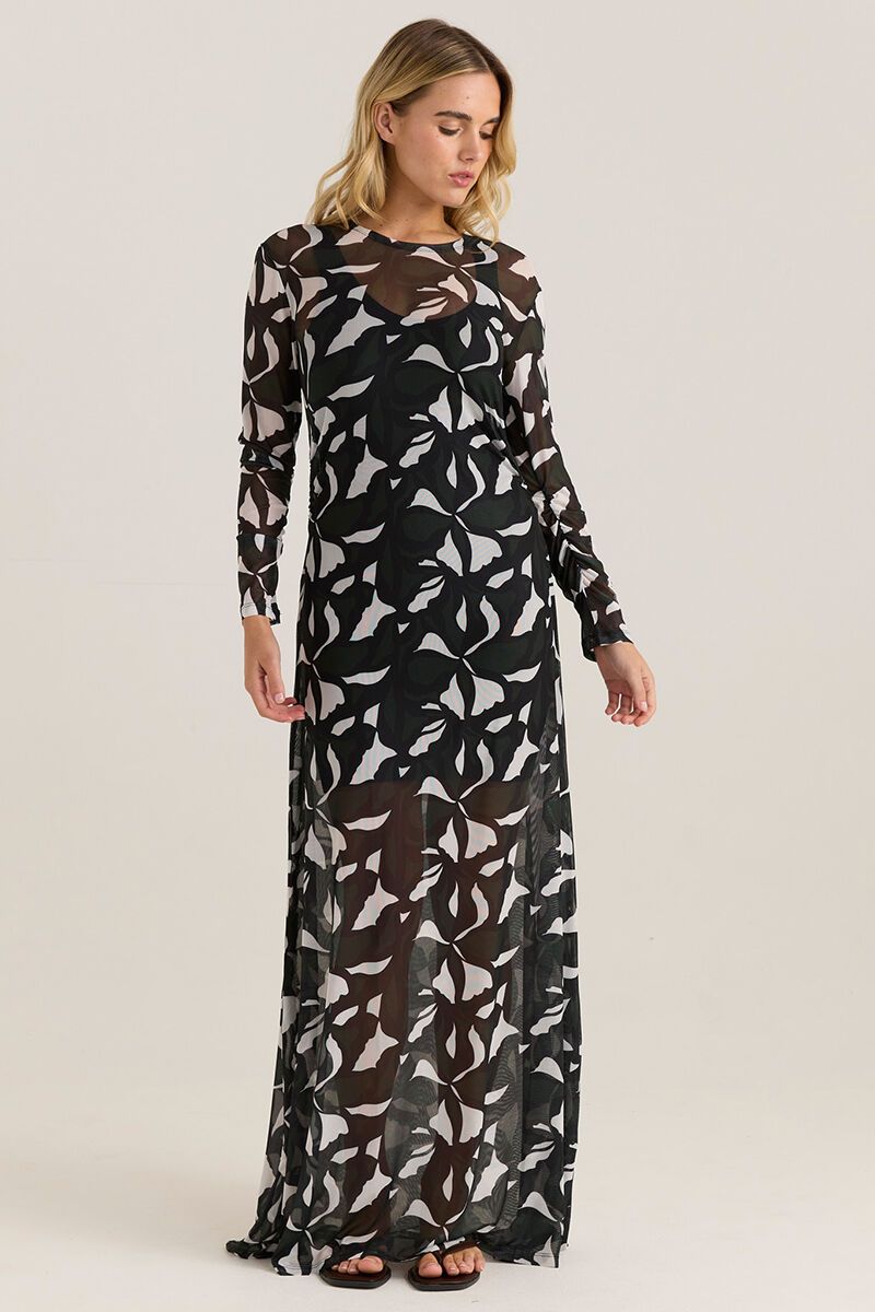 A sheer mesh maxi with long sleeves and fluid movement. Designed to layer or wear solo, it adds instant drama with minimal effort—perfect for evenings, events, or styled back casually with sneakers.