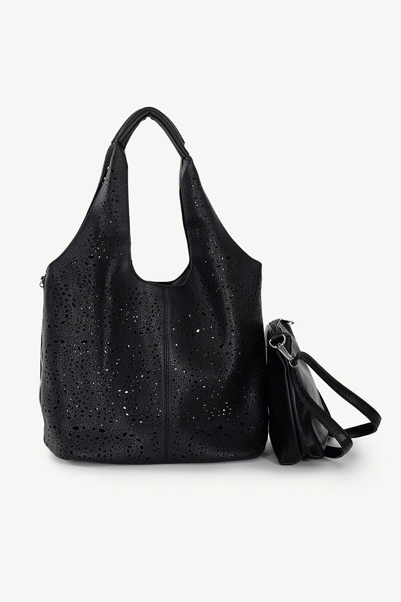 The Purdie Tote is a standout piece, featuring intricate laser-cut paisley designs across both the front and back — even extending to the reinforced handles for added detail and durability. Silver zippers run 27 cm down each side of the bag and can be unzipped to expand the bag’s capacity by an additional 10 cm, making it as practical as it is stylish.Inside, you’ll find a spacious removable pouch that doubles as either a crossbody bag or an internal organiser — ideal for switching from day to night with ease.