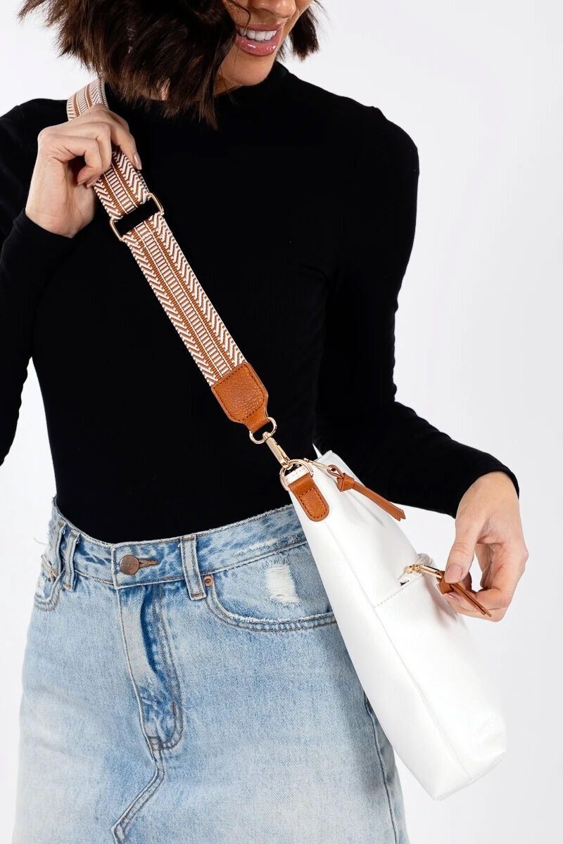External Features: The woven, patterned cotton cross body strap adds artistic flair to the bag.