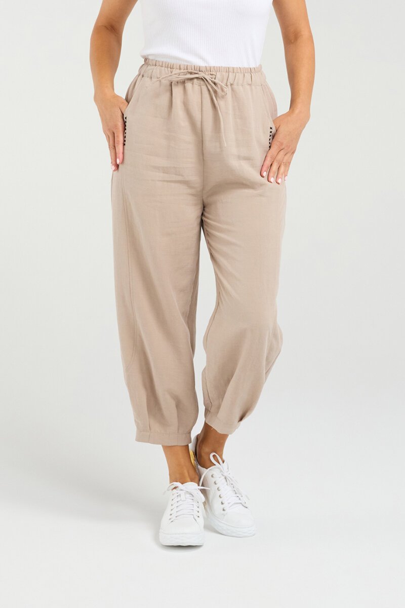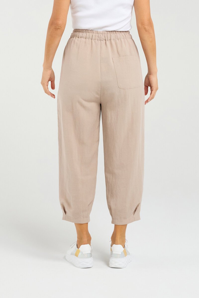 The Nova Pant blends everyday ease with thoughtful detail. Designed in a 7/8 length with a relaxed silhouette, it features an elasticated waistband and drawstring tie for the perfect fit. Cross-stitch detailing and softly pleated cuffs add a crafted finish that elevates this ankle-grazing style.