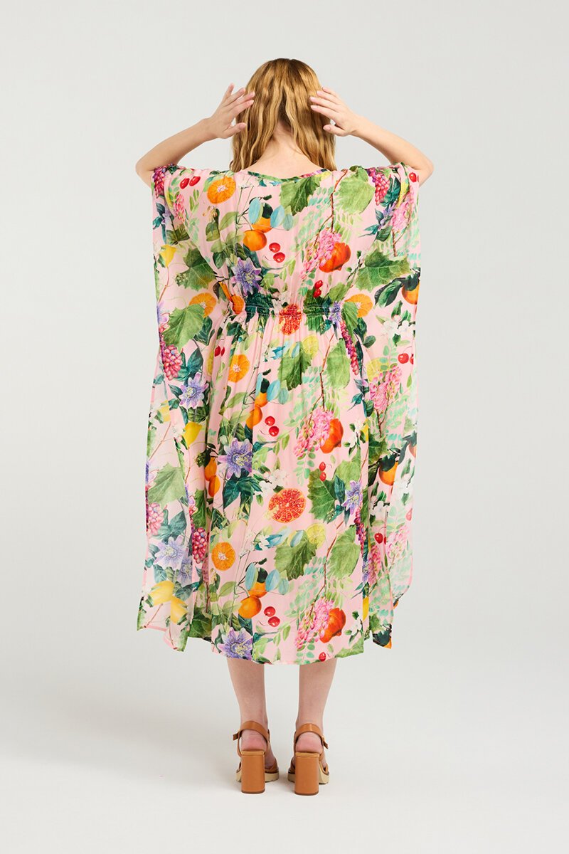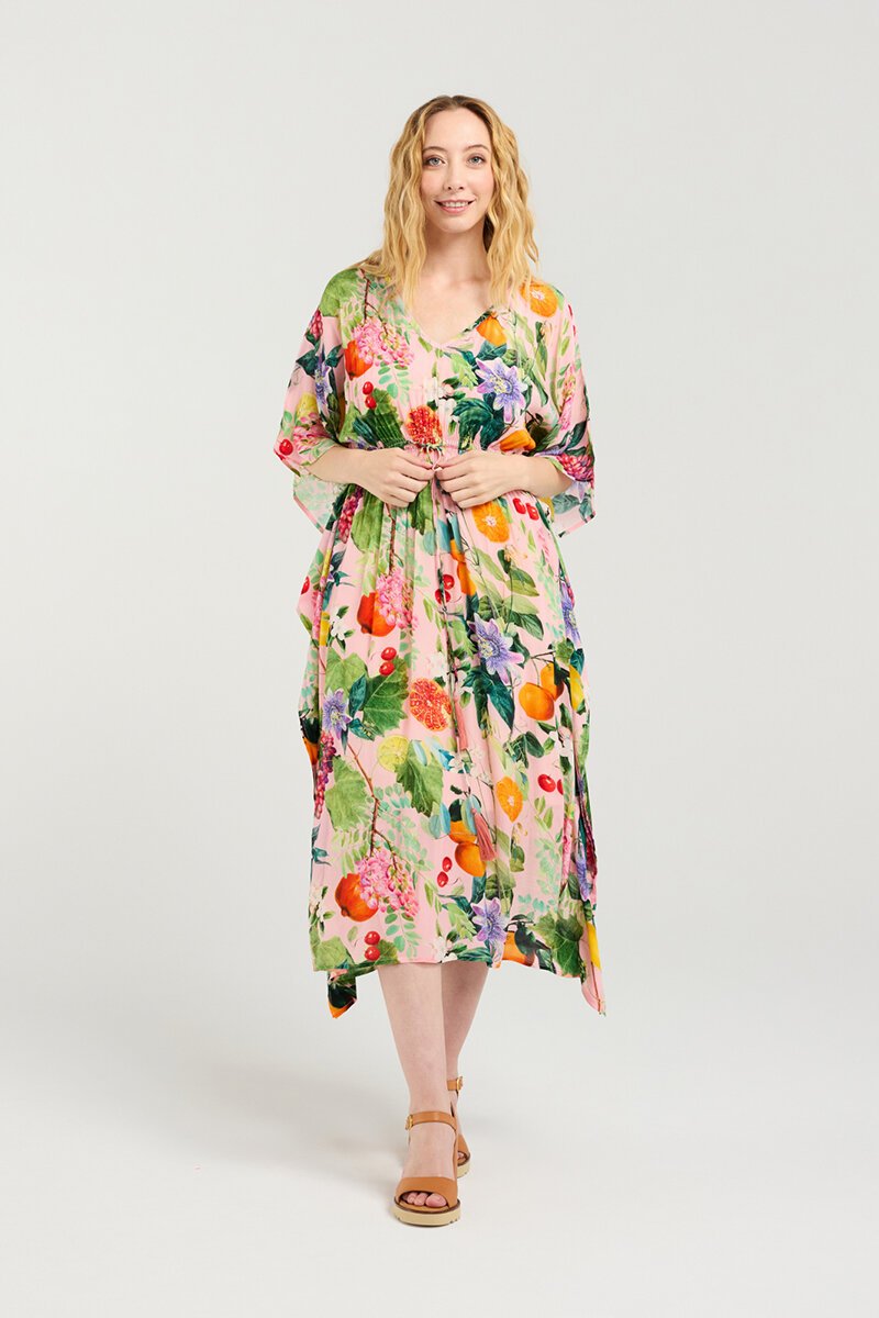 The Sonya Dress is pure holiday energy in a kaftan silhouette. Its vibrant tropical print sets the scene for sunshine days, while the relaxed shape and waist tie let you define your fit without losing that carefree flow.