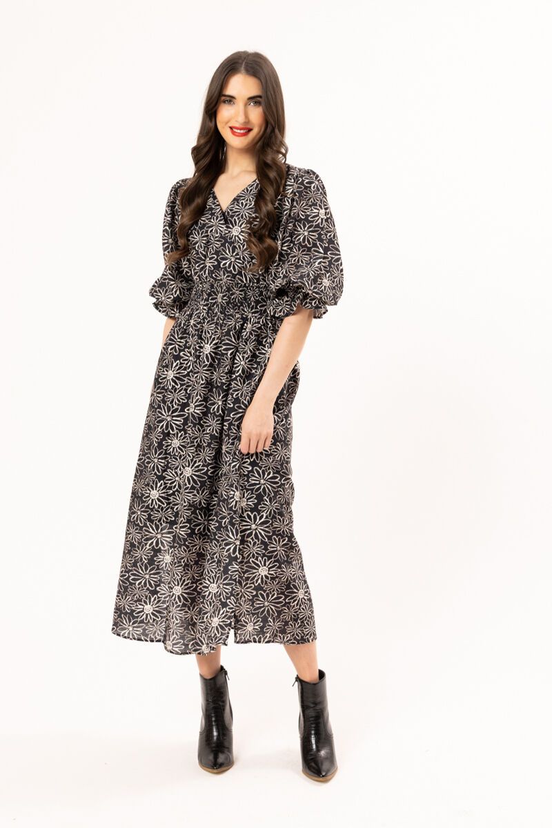The Seeking Lola Echo Dress is a flattering midi dress with a softly shaped waist and feminine sleeves. Easy to wear yet polished, perfect for workdays, dinners, and everything in between.