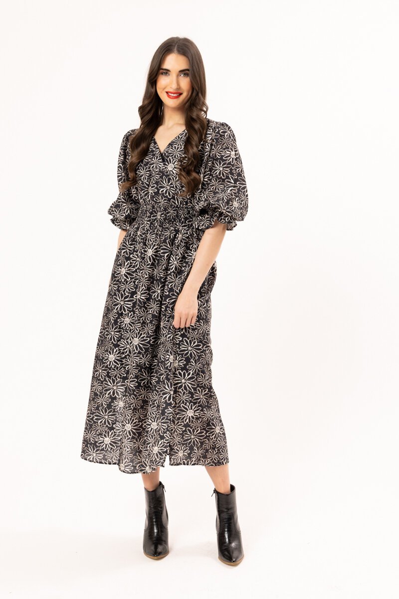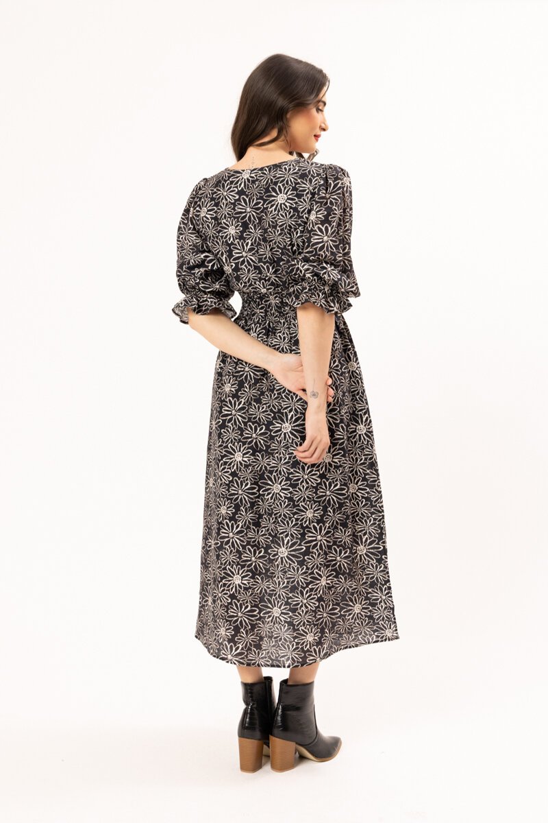 The Seeking Lola Echo Dress is a flattering midi dress with a softly shaped waist and feminine sleeves. Easy to wear yet polished, perfect for workdays, dinners, and everything in between.Garment Features