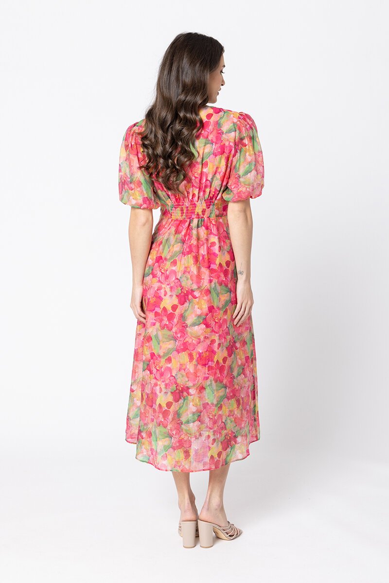 The Seeking Lola Canvas Bloom Cheerful Dress is a vibrant midi with a button-through front, puff sleeves, and a soft A-line silhouette. Its lively floral print makes it perfect for sunny days, garden parties, or weekend getaways.