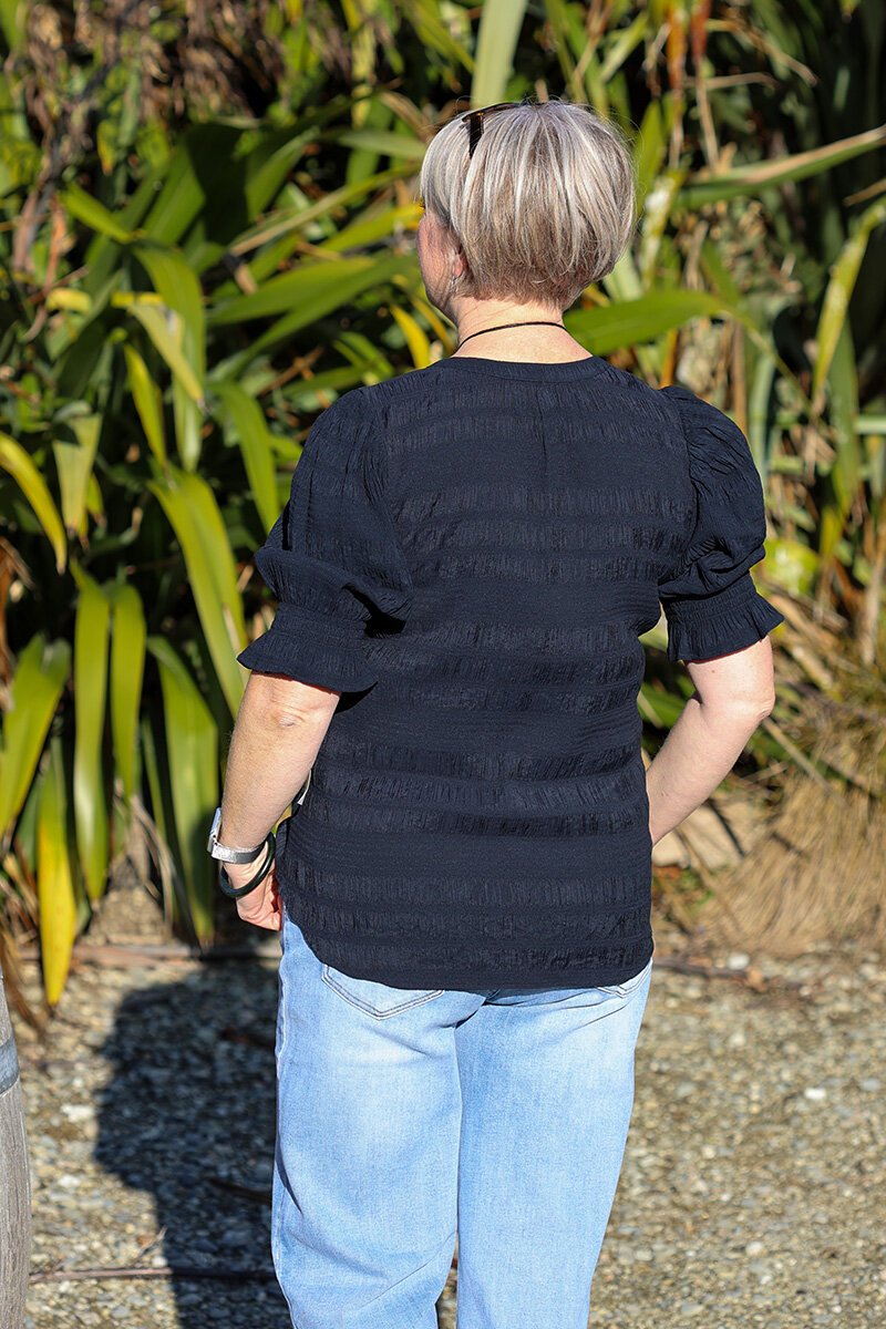 The Seeking Lola Carefree Butterfly Top in navy is cut from a softly textured stretch fabric that feels as good as it looks. With puff sleeves, a flattering V-neckline, and gathered cuff detailing, it’s an effortless style for both workdays and weekends.