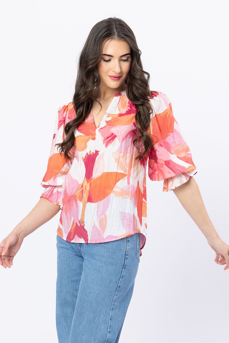The Seeking Lola Pink Graceful Top brings bright summer energy with its floaty shape and bold floral print. Light, airy, and easy to style with denim or a dressy pant, it’s a feel-good favourite for warm days.