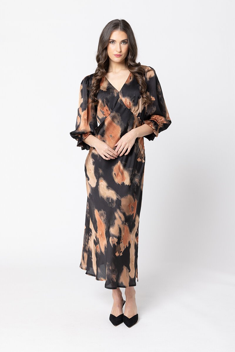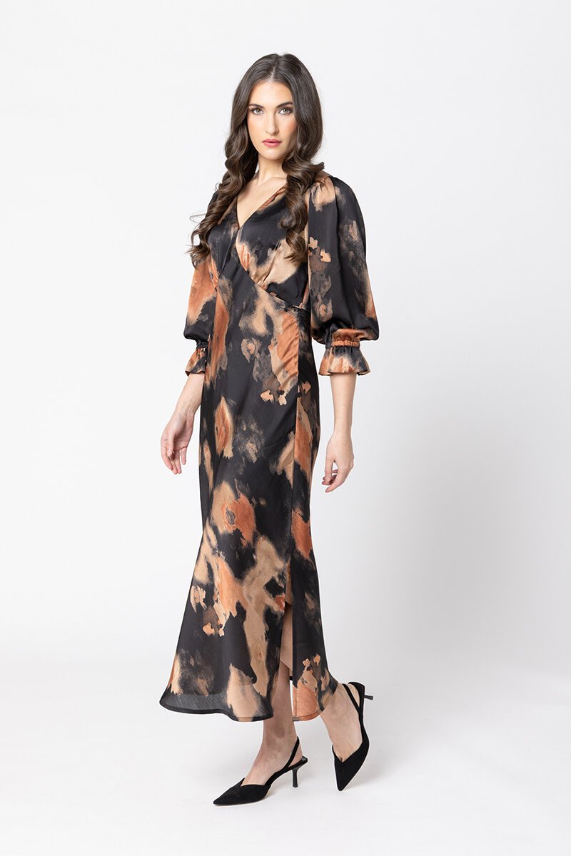 The Seeking Lola Smudge Inviting Dress is a statement-maker with its moody, painterly print and flattering wrap silhouette. Featuring voluminous sleeves with gathered cuffs and a sleek side split, it’s the perfect mix of drama and elegance for evening occasions.