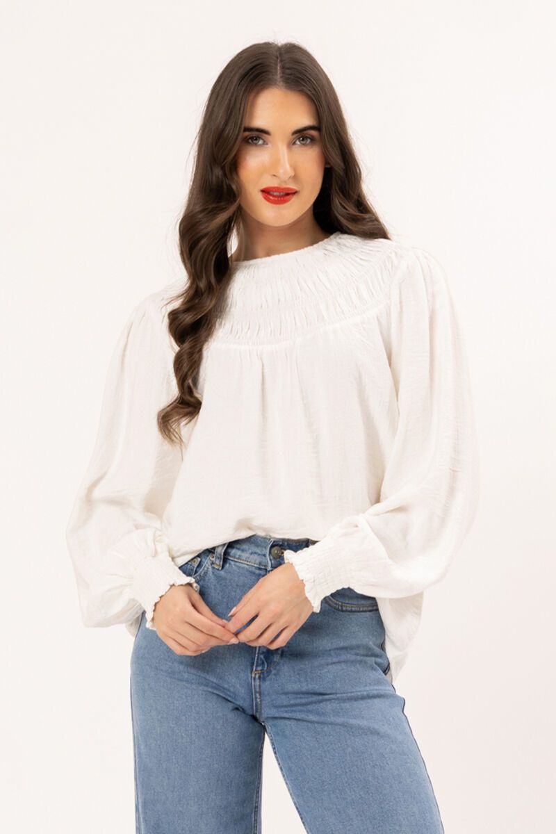 The Seeking Lola Devotion Top in Soft White is soft, floaty and a little bit romantic. The shirred neckline adds beautiful detail, while the relaxed shape makes it easy to wear tucked or loose.