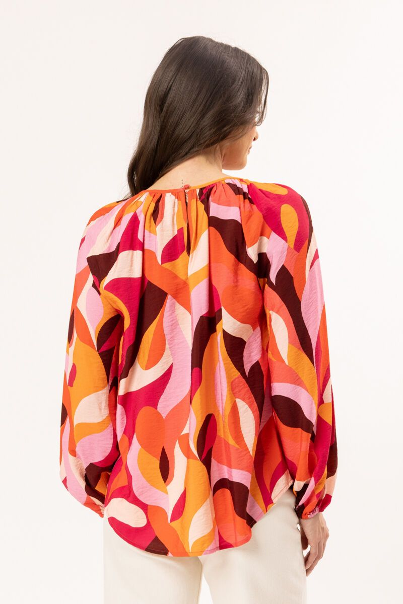The Seeking Lola Warm Vibes United Top is a relaxed, easy-wear blouse with soft gathers and statement sleeves, finished in a bold, feel-good print that lifts everyday denim and tailored looks alike.