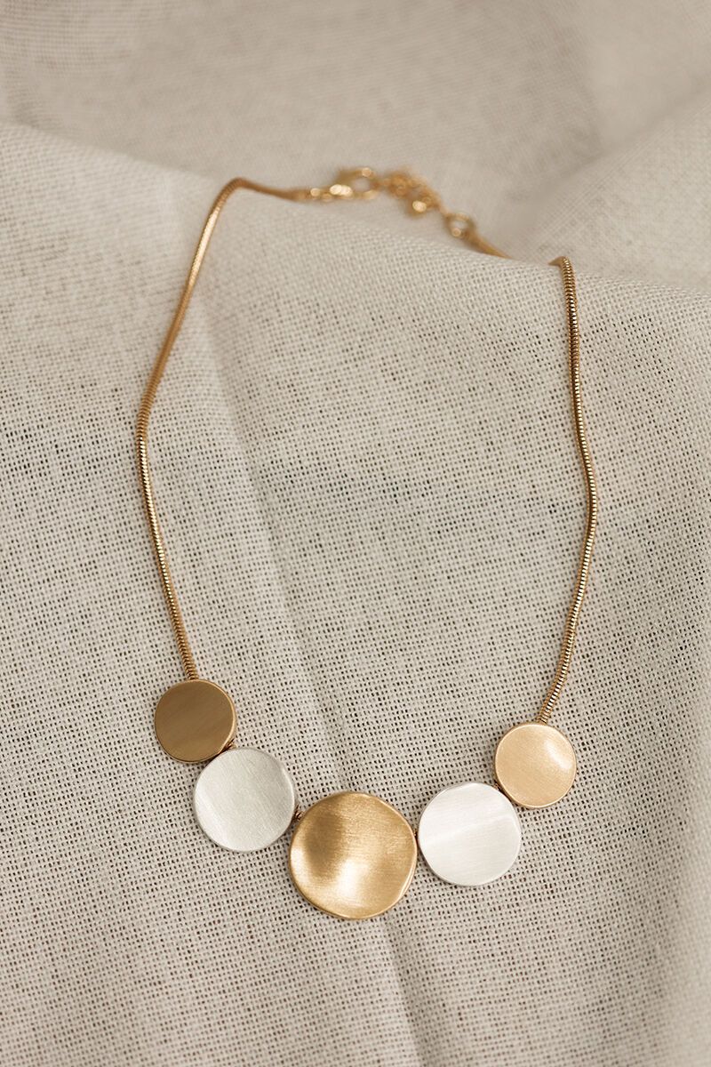 The She Jewellery Disc Necklace is an easy statement with a modern feel. Brushed discs in mixed tones create soft contrast and shine—lightweight, versatile, and perfect for finishing off your everyday looks.