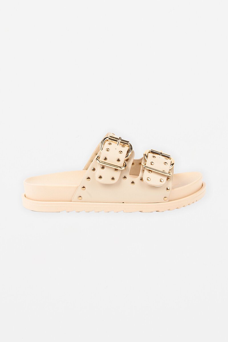 The Stella + Gemma Amelia Slide brings edge to everyday. Featuring gold studs, chunky buckles, and a soft neutral tone, they’re comfy, cool, and made to stand out. Just the right mix of glam and go-with-everything ease.