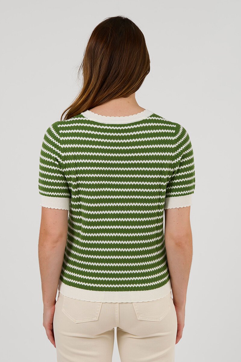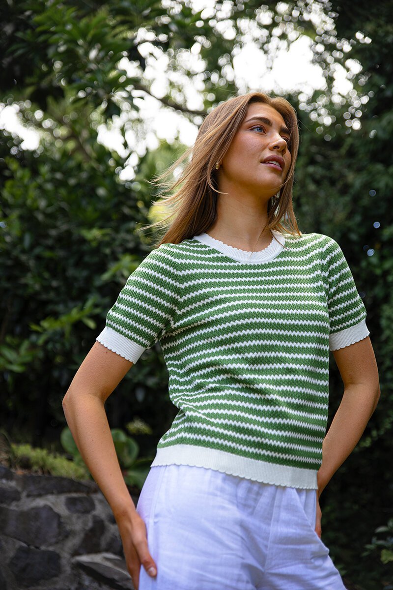 The Stella + Gemma Charly Green Stripe Top is a playful, textured knit that’s perfect for everyday wear. With short sleeves, a classic crew neckline, and bold green-and-white striping, it’s an easy piece to pair with denim or skirts for a fresh, casual look.