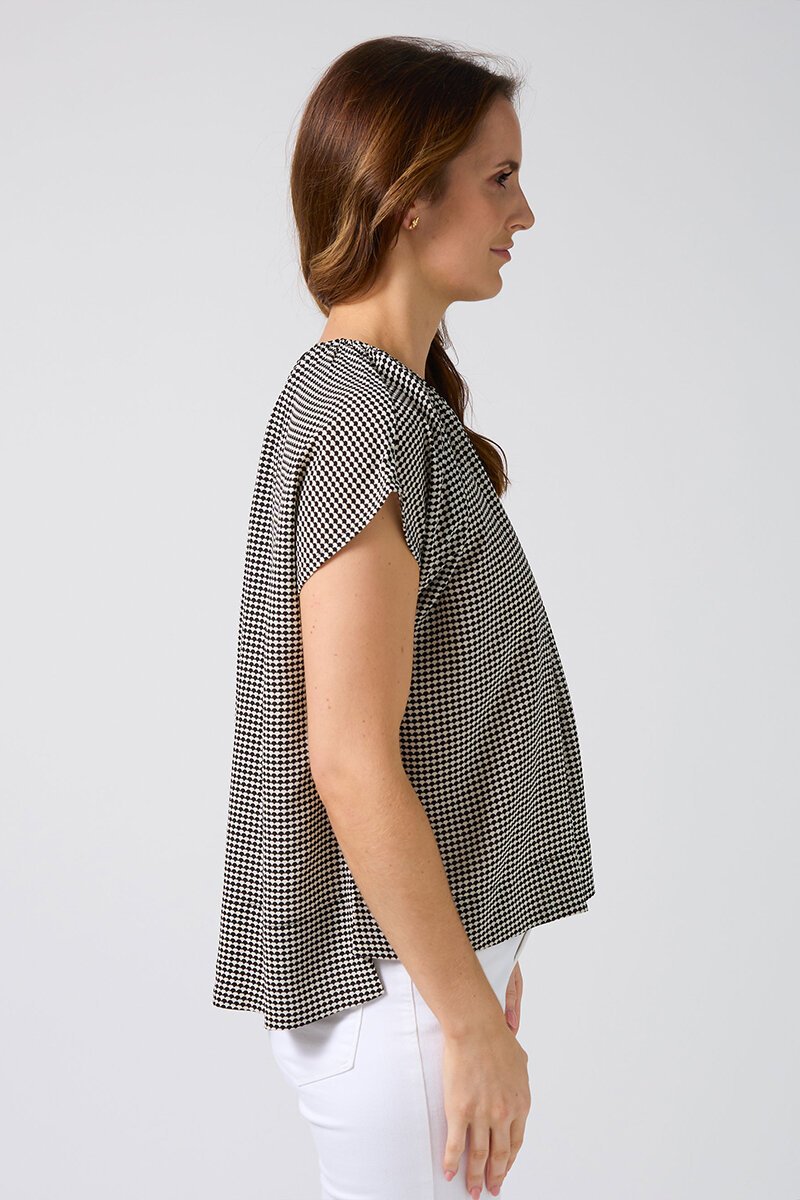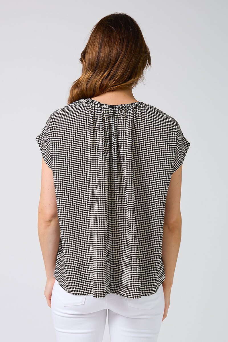 The Stella + Gemma Clio Blouse features a soft gathered neckline, cap sleeves, and an easy, relaxed fit. Finished in a striking fish scale print, it’s polished yet effortless for everyday wear.