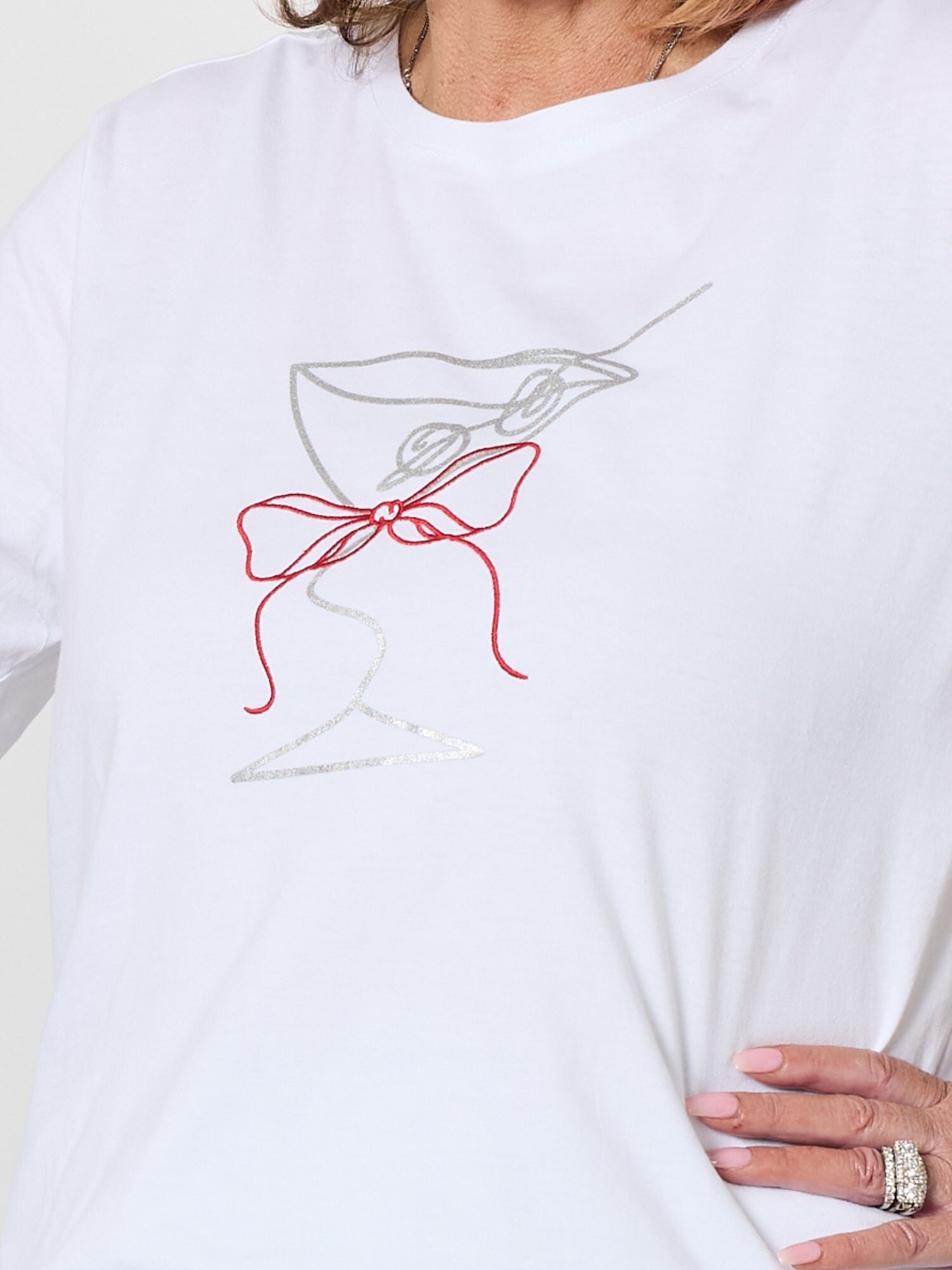 The Threadz Martini Tee is the ultimate mix of fun and festive. With its cheeky martini glass design and pop of red bow, it’s made for long lunches, summer sips, and good vibes only. Style it with a pleated skirt or denim for instant party spirit.