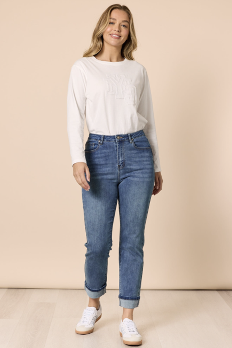 The Threadz Retro Cuff Jean is an easy everyday denim with a flattering high rise and straight leg. Finished with a cuffed hem and soft stretch, it’s made for comfortable, all-day wear with effortless polish.