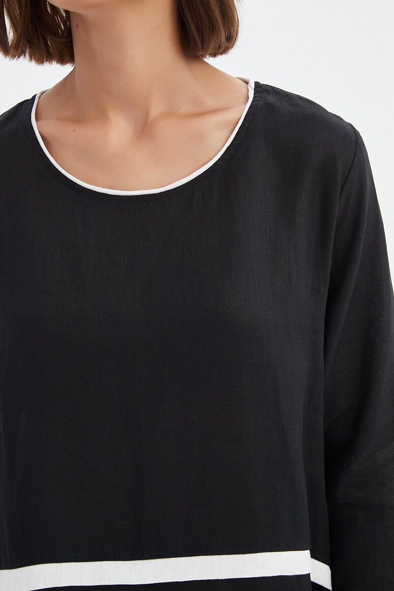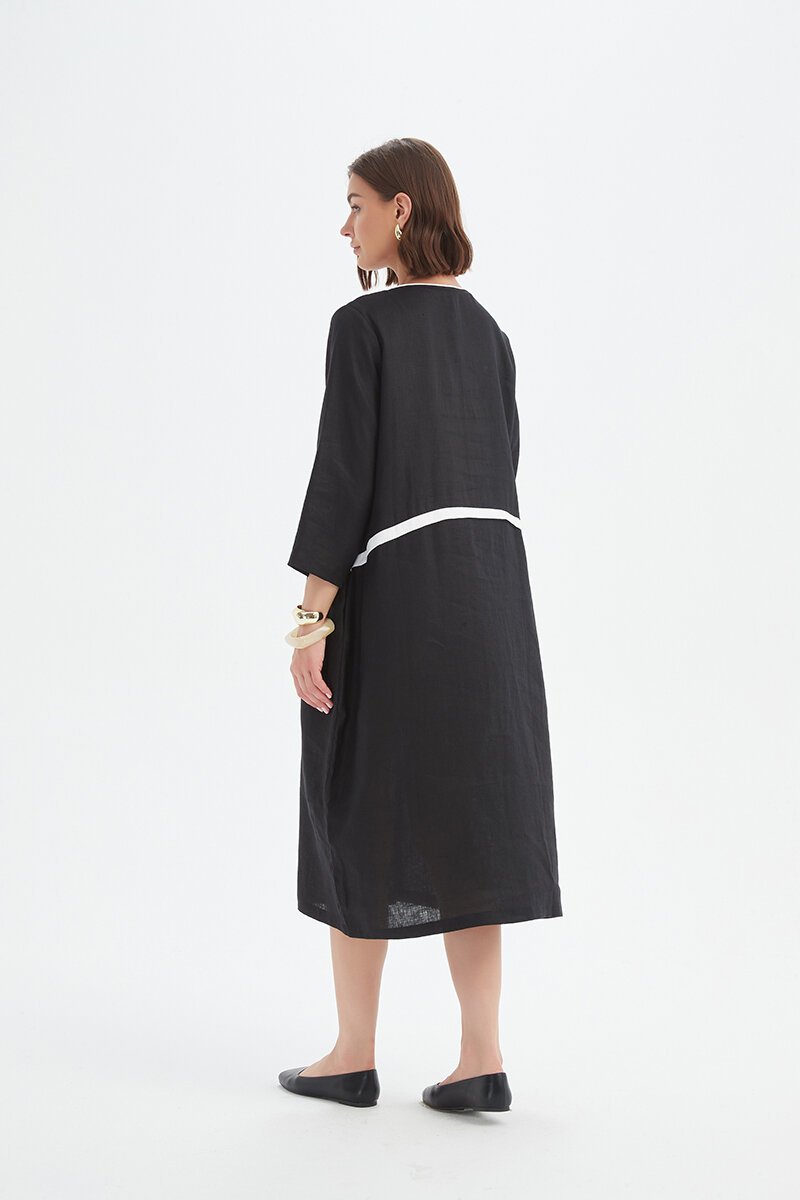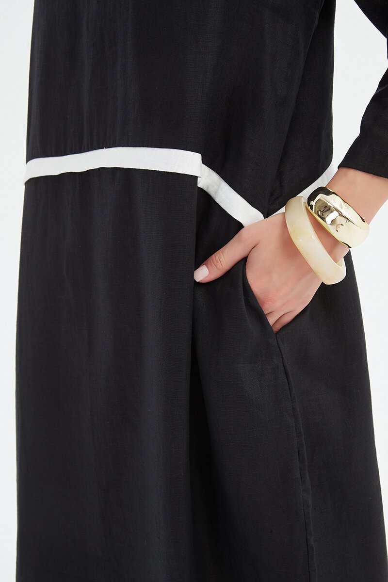 The Tirelli Contrast Trim Ovoid Dress is understated and elegant — the kind of piece that works for any occasion. Designed in a soft linen blend, it features contrast piping, a relaxed ovoid silhouette, and practical pockets. Effortless, polished, and perfect for days when you want comfort with a little sophistication.
