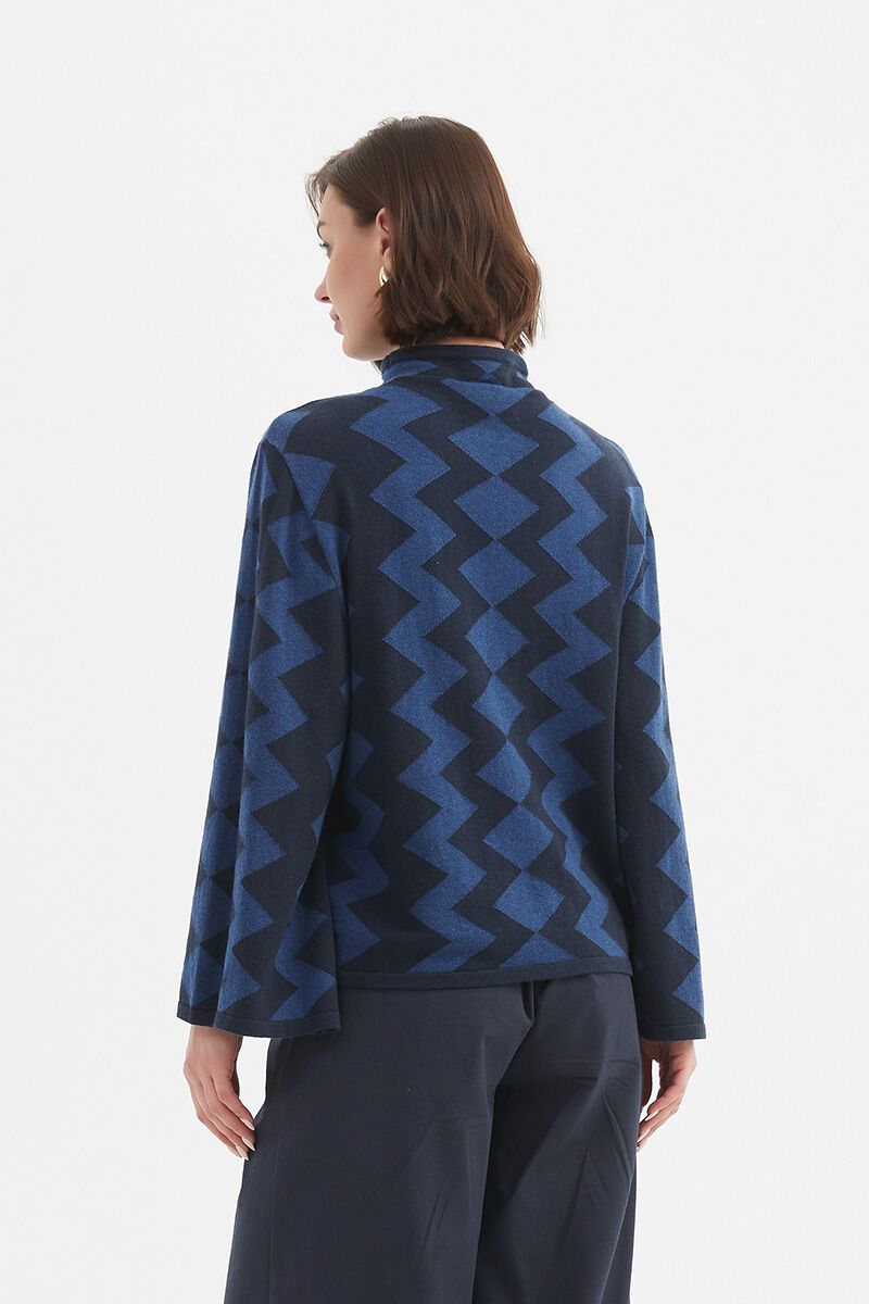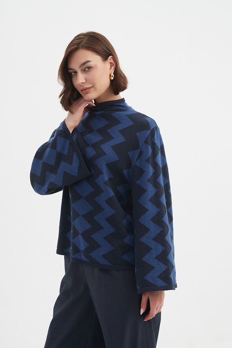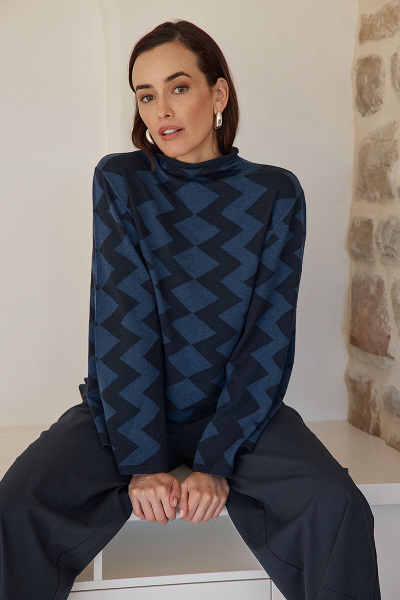 Say hello to your new statement knit. The bold geometric design gives this soft, structured piece a fun edge, while the mock neck and subtle swing shape keep it feeling sophisticated. This Tirelli Mirrored Chevron Knit is equal parts bold and wearable—a definite mood-lifter for winter.
