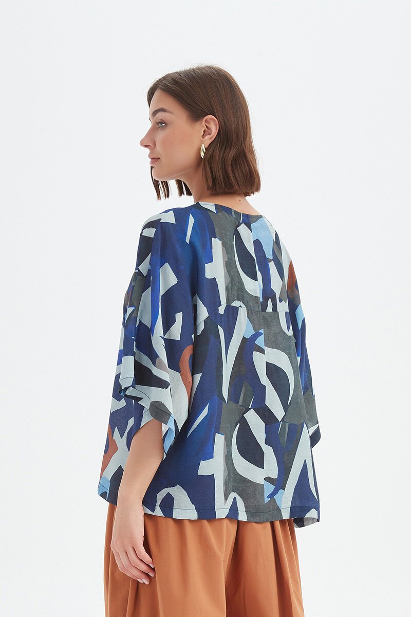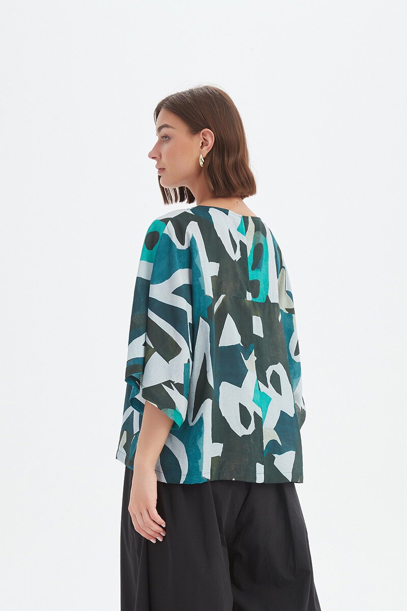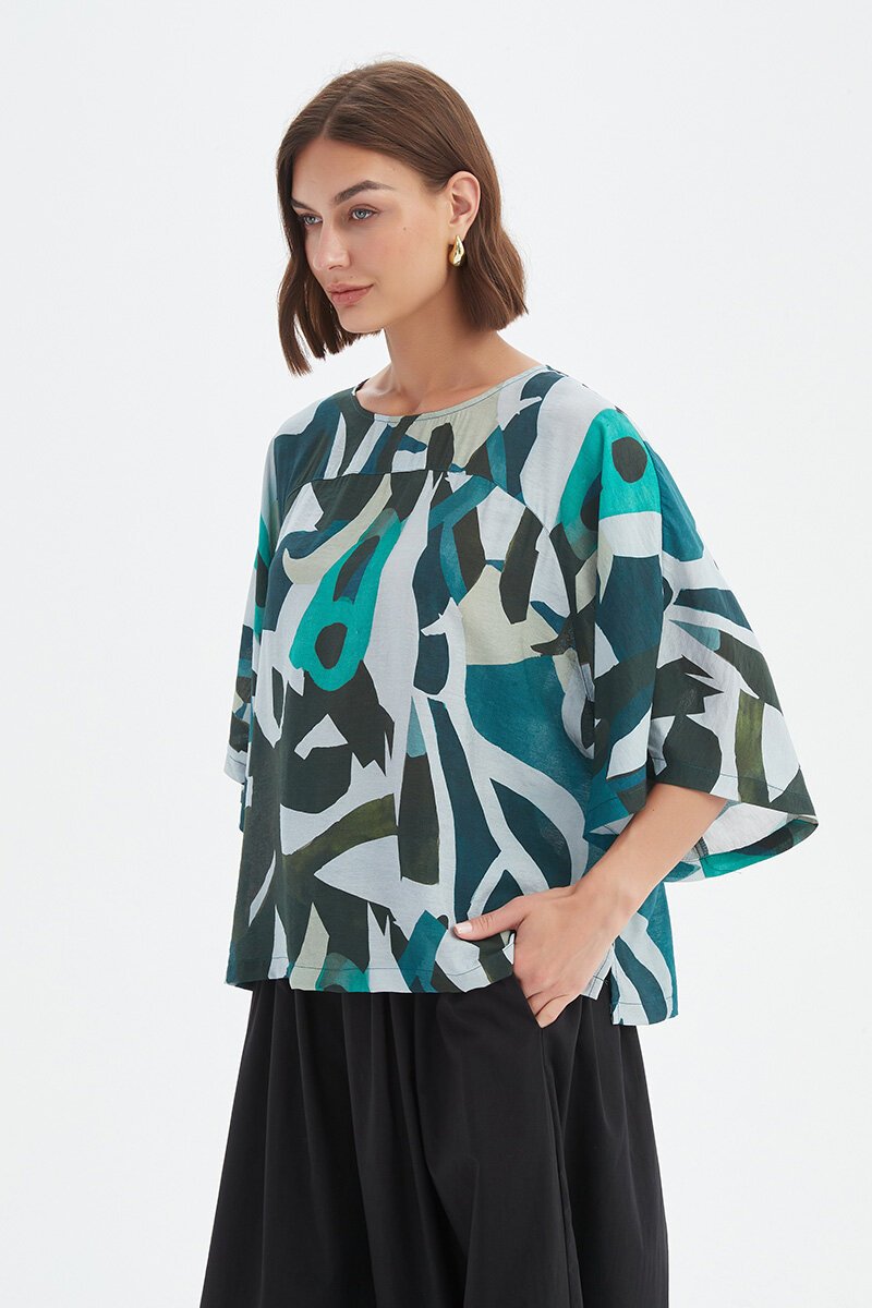 The Tirelli Wide Sleeve Print Top is relaxed yet striking — the perfect mix of artful and easy. Crafted in lightweight fabric, it features an abstract print, a soft round neckline, and wide, drapey sleeves that move beautifully. Pair it with linen pants or shorts for effortless summer polish.