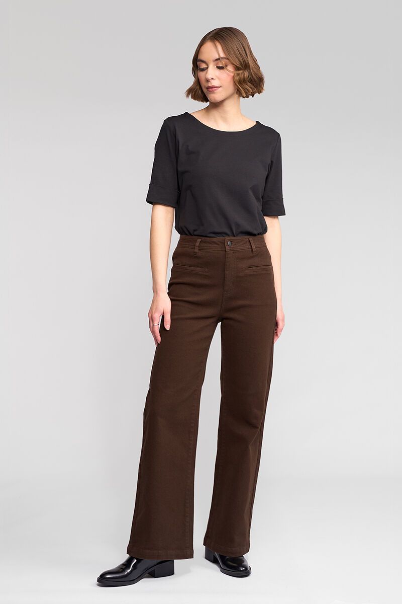 Wide-leg full-length jean in rich chocolate denim, featuring front welt pockets and a clean, modern silhouette. A polished update on classic denim with an on-trend feel for everyday wear. Perfect for pairing with sneakers or boots, they’ll elevate any casual or dressed-up look.