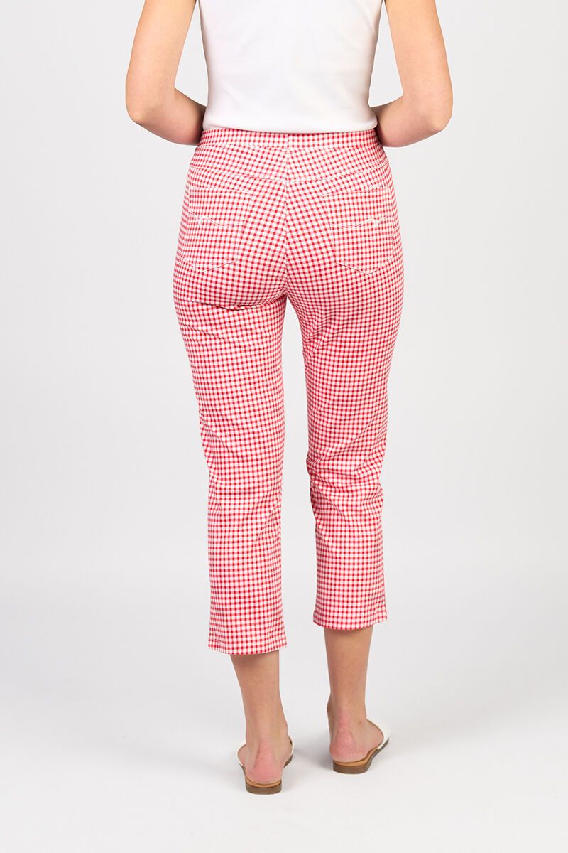 Say hello to playful polish with the Vassalli Slim 7/8 Lightweight Pull On Pant in Red Gingham. Designed in a breathable fabric with a flattering slim leg and easy pull-on waistband, these are your go-to for everyday ease with a fun pop of print. Style them with crisp whites or soft knits for a fresh, feel-good look.