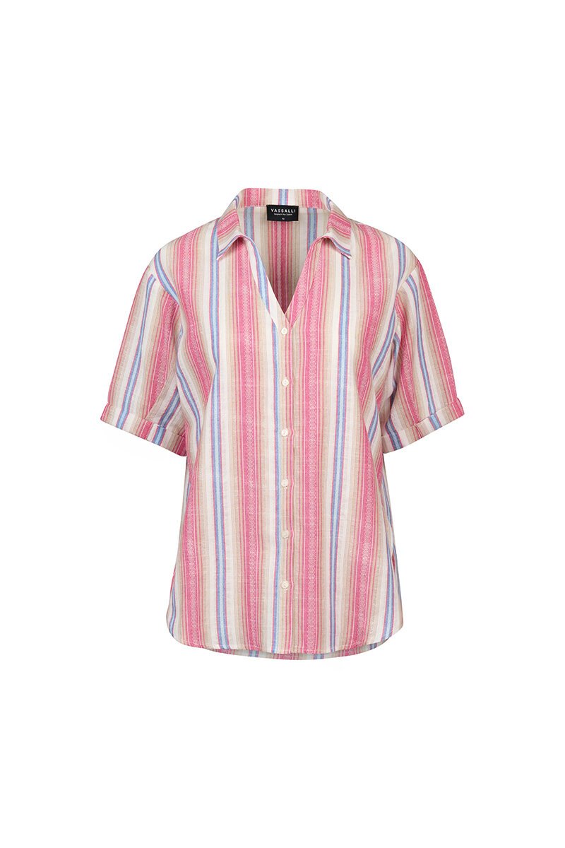 The Vassalli Stripe Dropped Shoulder Shirt with Rounded Hem is light, relaxed, and ready for summer days. Crafted from breathable cotton fabric, it features a button-through front, rolled short sleeves, and an easy curved hem — perfect for tucking, tying, or layering.
