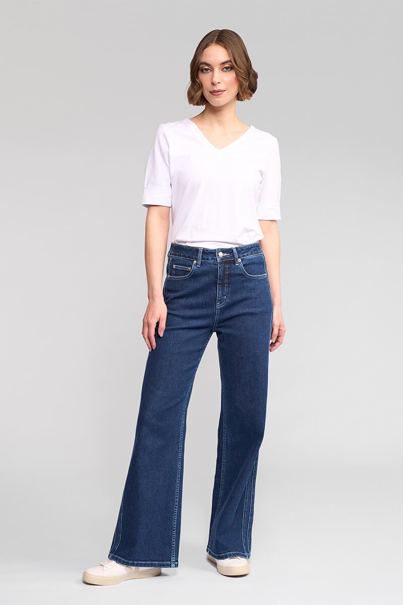 Wide-leg full-length jean in dark blue denim, reflecting a modern silhouette. Finished with double side seam detailing, this flattering style elongates the leg and delivers an easy, polished option for everyday wear.