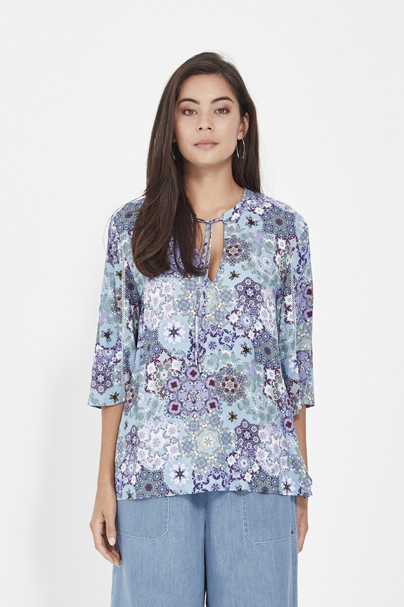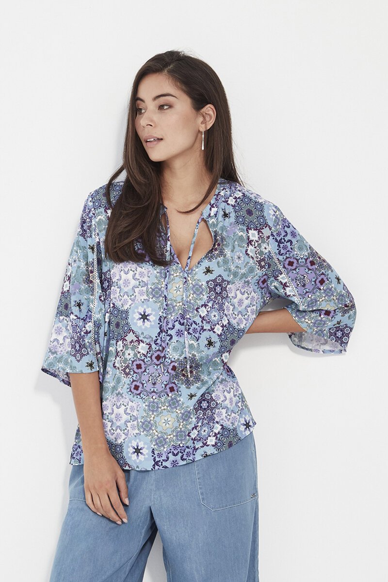 The Illusion Top is crafted in soft-touch rayon with an exclusive Verge print. Featuring a V-neck with adjustable ties and flared elbow-length sleeves, it skims the body for an easy, flattering fit.