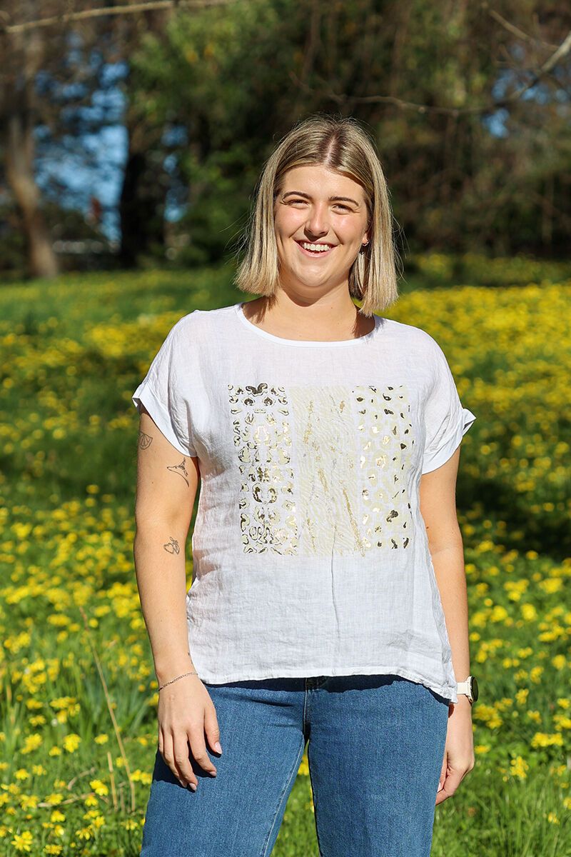 The Wednesday Lulu Foil Animal Print Top is a fun, easy piece to slip into any day of the week. With its relaxed shape and bold foil animal print front, it’s an instant style lift for your casual lineup.