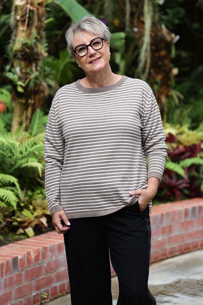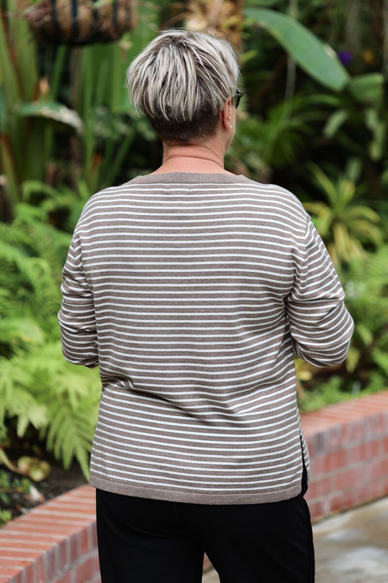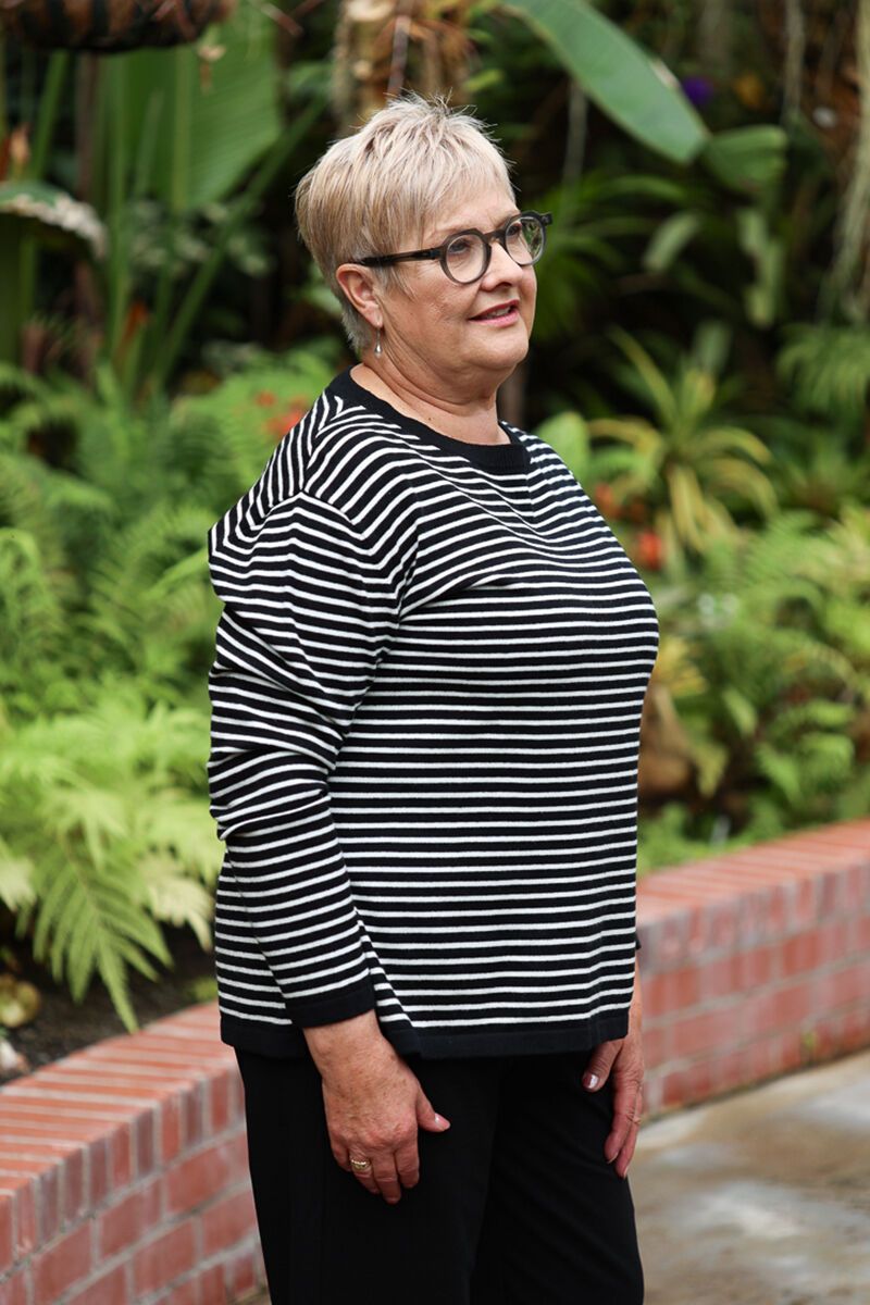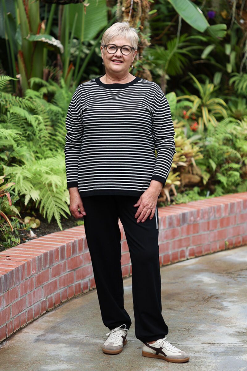 A timeless striped knit designed for everyday comfort. The White on Black Stripe Crew features a classic crew neckline and relaxed fit, making it an easy piece to throw on with your favourite pants or denim.