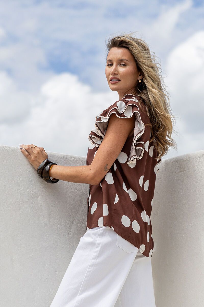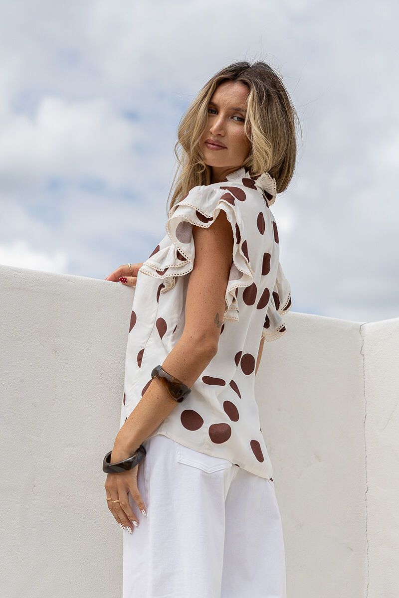 The White Poetry Polka Dot Ruffle Shoulder Top brings a playful twist to polished dressing. Lightweight and floaty with soft ruffle sleeves and button-through front.