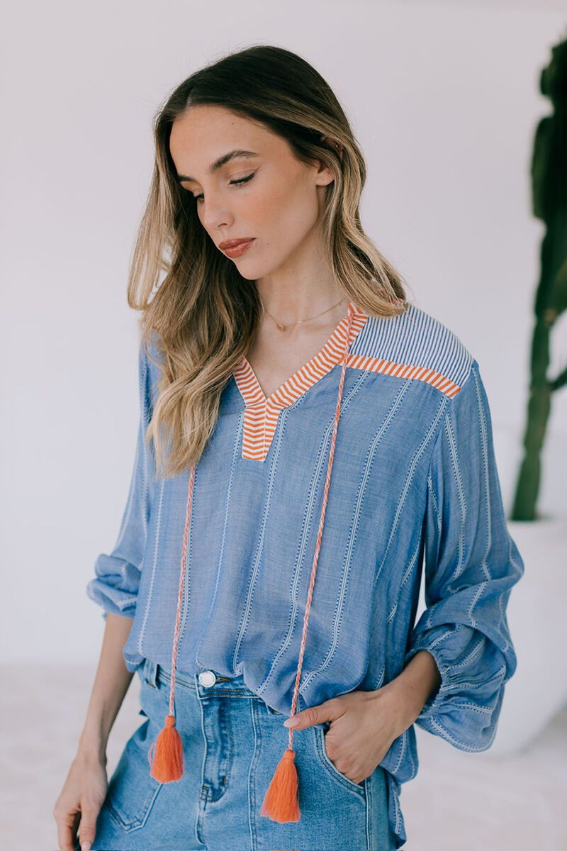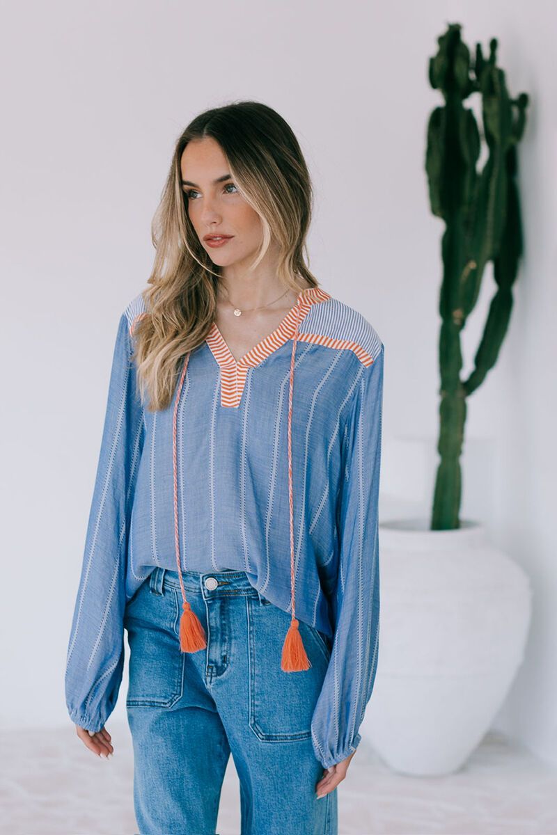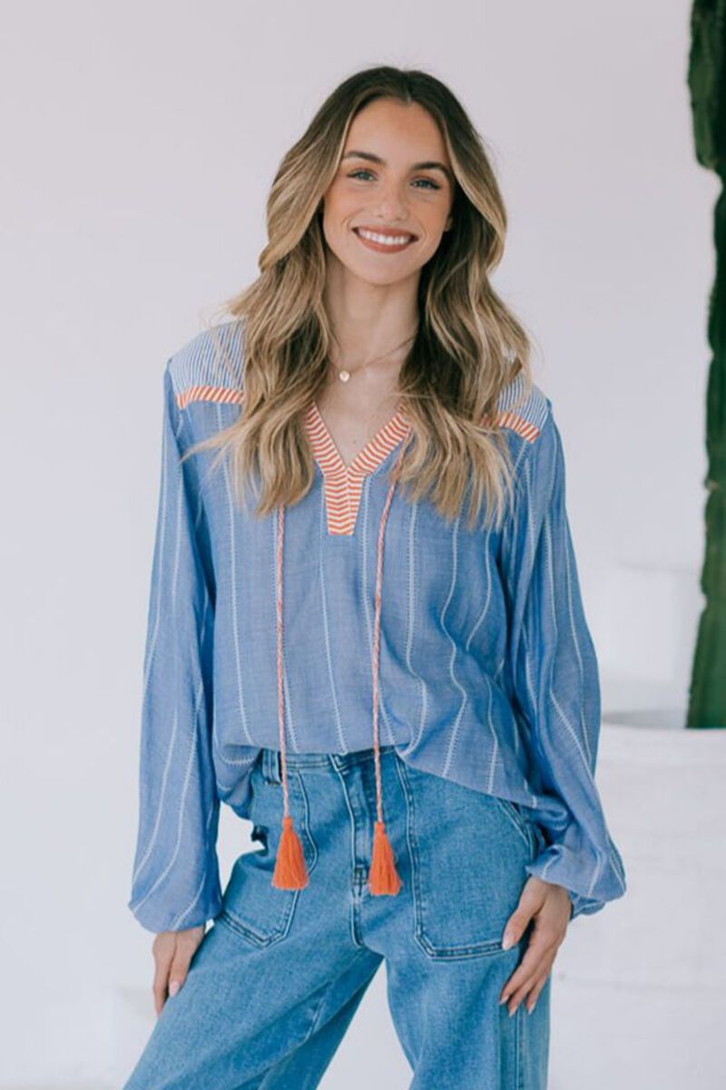 The White Poetry Santorini Top brings an instant touch of relaxed summer style. Designed in a soft, lightweight fabric with fine stripes, contrast stitching, and playful tassel ties, it’s that perfect mix of easy and elevated.