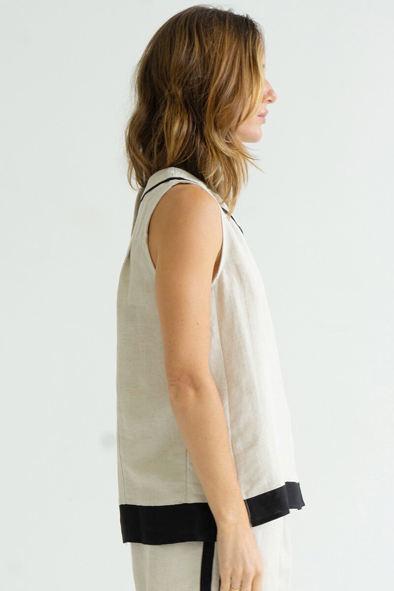 The Worthier Linen Blend Vest is the kind of top that makes simple look stylish. With a soft linen-blend feel, contrast trim detailing, and a relaxed sleeveless cut, it pairs beautifully with the matching shorts or wide-leg pants for easy, polished summer dressing.