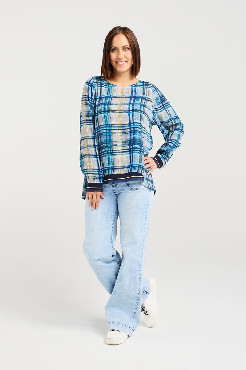 The Zafina Havana Ocean Plaid Top is an easy everyday style with a relaxed shape and fresh ocean-toned plaid. Soft gathers through the sleeves and ribbed trims give it a comfortable fit that pairs beautifully with denim or casual pants.